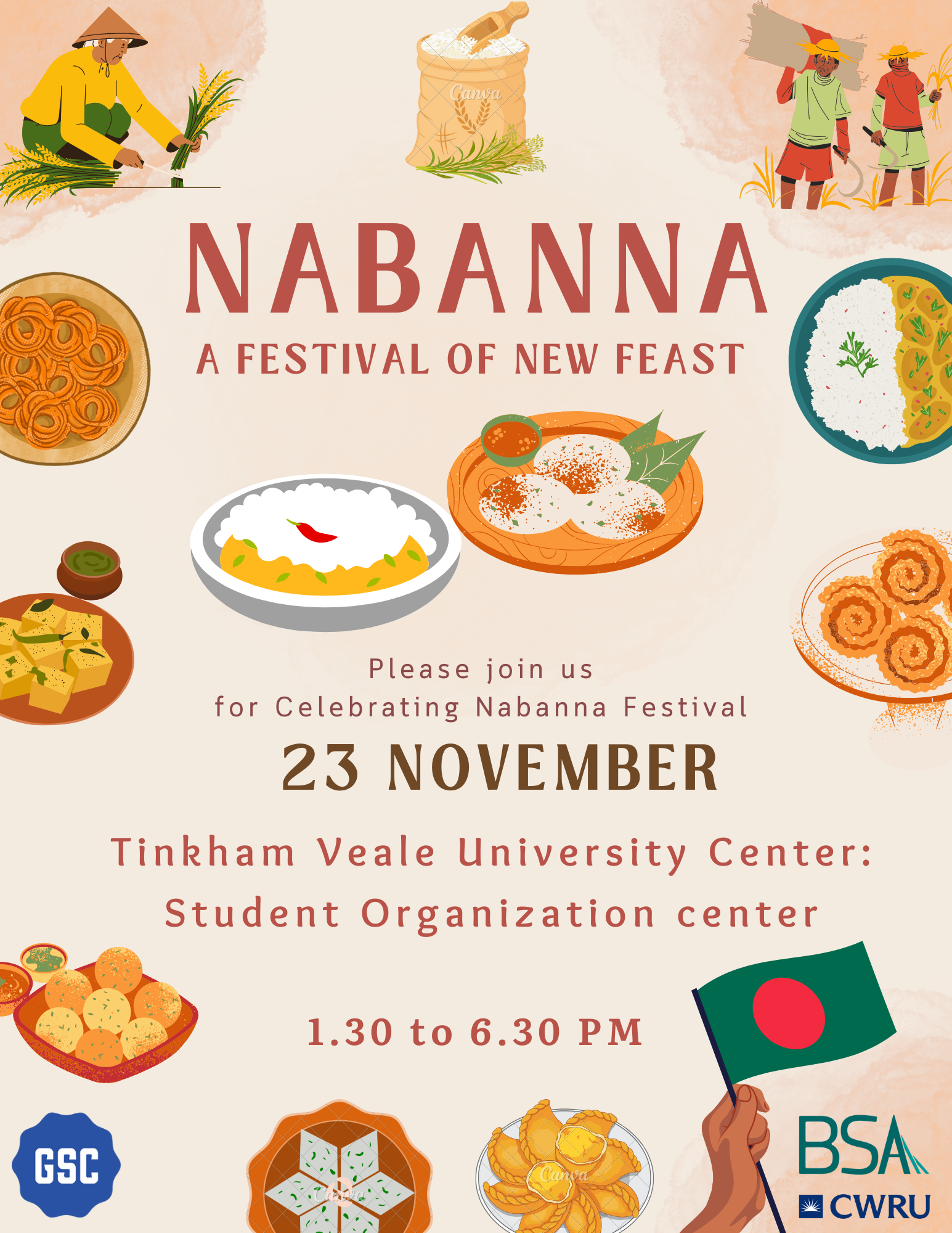 The Bangladeshi Student Association and the Graduate Student Council invite you to Nabanna, November 23, 1:30-6:30pm, at the Student Organization Center (Tinkham Veale University Center)! In the heart of Bangladesh, a cherished tradition flourishes: the Nabanna festival, which celebrates the season’s first harvest. Derived from Bengali words “nabo” (fresh) and “anna” (food), Nabanna signifies the joy of sharing fresh bounty with loved ones. The Bangladeshi Student Association warmly invites you to join us in honoring this beautiful heritage. Together, we’ll enjoy traditional Bangladeshi cuisine, relax, and connect in a spirit of celebration and community. Come for the food, stay for the fun—raffle prizes await! Celebrate with us and experience the vibrant culture of Bangladesh.