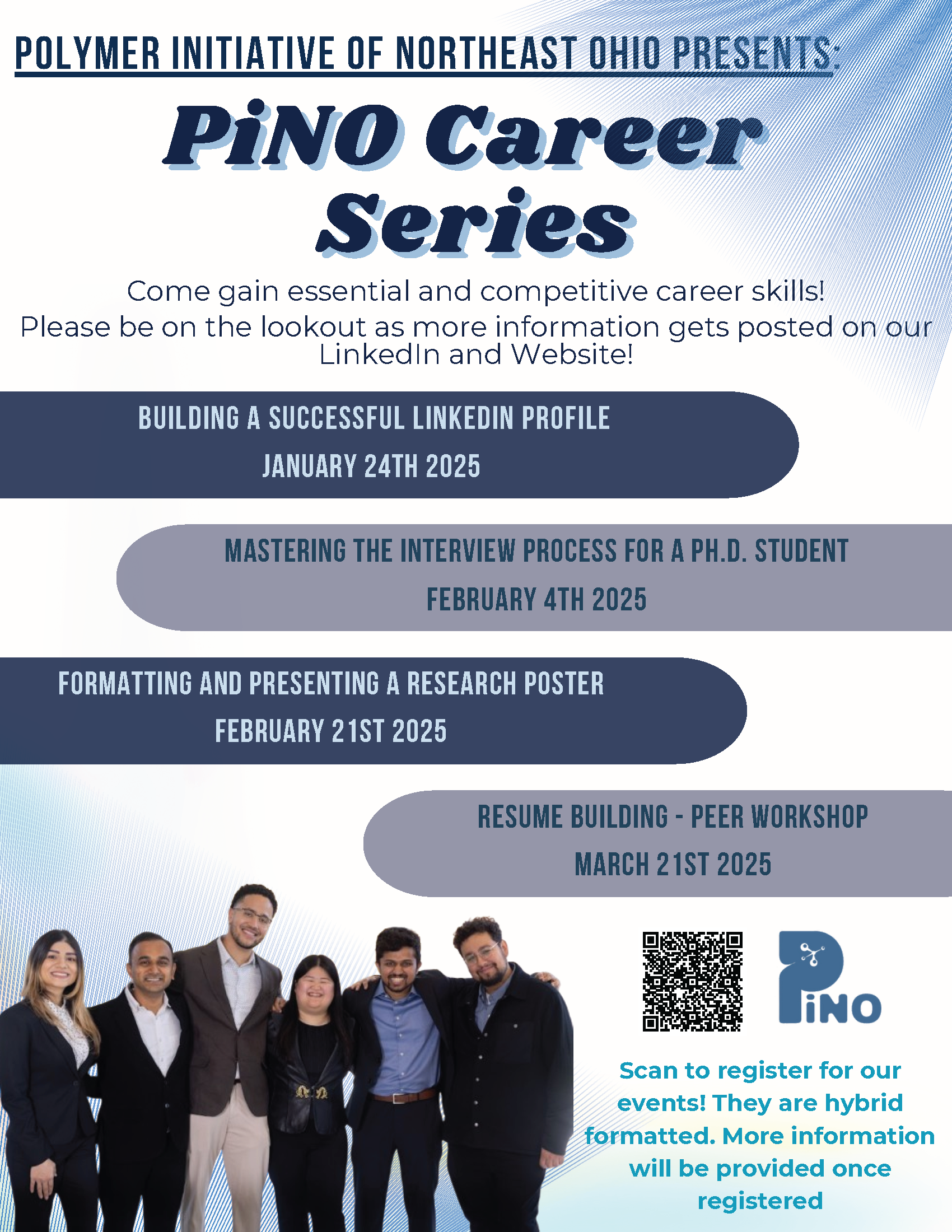 The Polymer Initiative of Northeast Ohio presents the PiNO Career Series, a four-part event that prepares you with essential and competitive skills. Graduate students in engineering disciplines! Defending your dissertation and need help preparing for interviews? Presenting your research at a conference and need help preparing your poster? We've got you covered! The date and time for the events are mentioned in the poster. The location will be shared with the registered participants. Participants can also join via Zoom links.